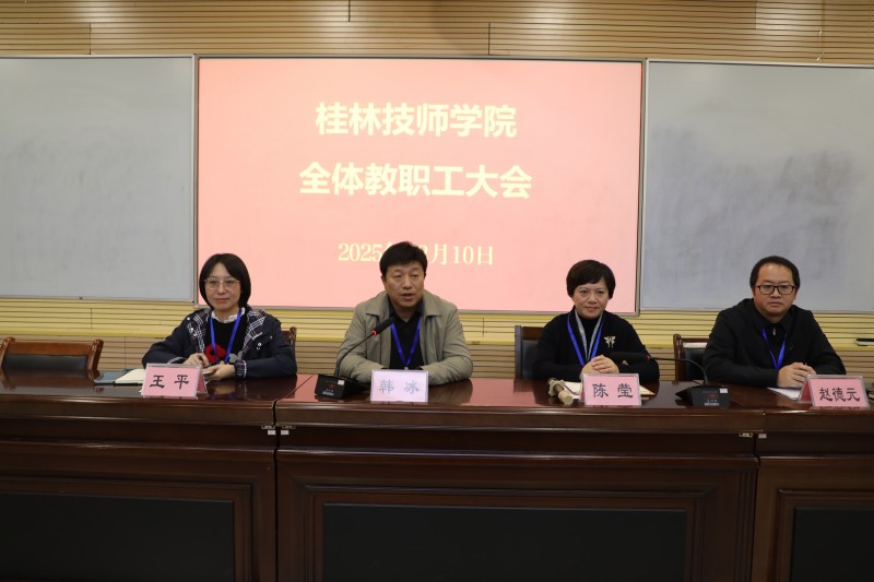 12月10日下午,我院召开全体教职工大会。会议以深入学习党的二十届四中全会精神为引领,紧密围绕自治区“十五五”规划中“加快建设制造强国、推进教育科技人才一体化发展”的要求,结合桂林市深化产教融合、实施“技能广西行动”及打造世界级旅游城市人才新高地的工作部署要点,全面总结本年度过往工作成效,系统部署后续任务,凝聚发展共识。学院党委书记韩冰,纪委书记、副院长陈莹,党委委员、副院长王平、赵德元出席会议。