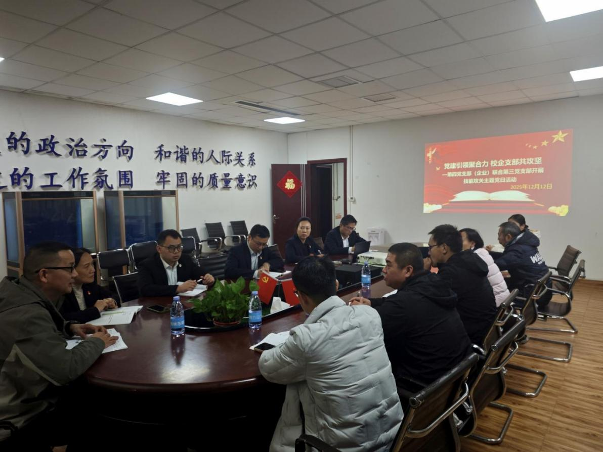 为深入推进党建与业务深度融合,搭建校企协同育人、技术攻关的“红色桥梁”,12月12日上午,学院第四党支部(东明大众4S店,校办企业)与第三党支部联合开展“技能攻关”主题党日活动。双方党员代表、技术骨干及教师代表齐聚一堂,围绕校企合作、技能提升、人才培养等议题深入交流,共谋发展。