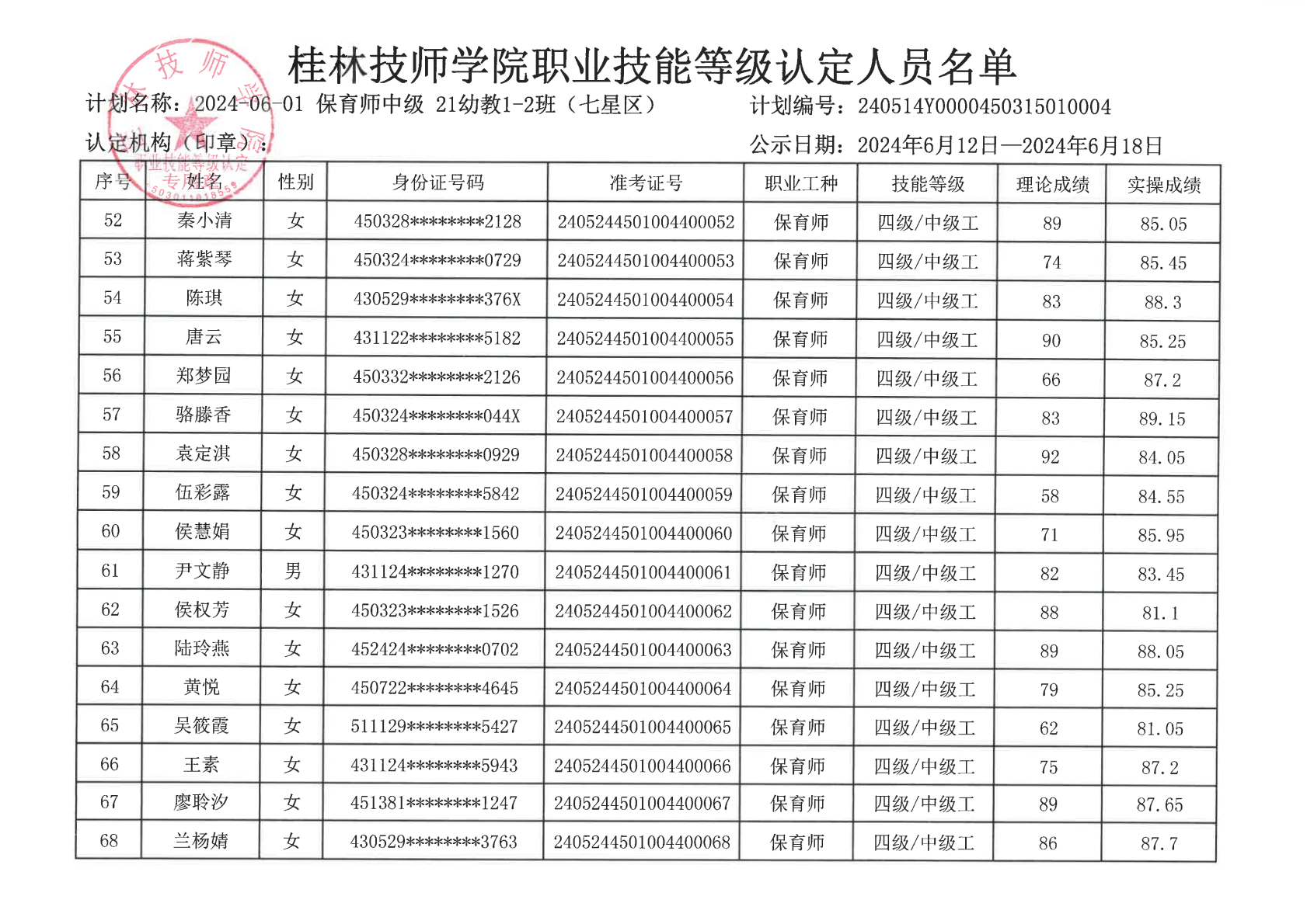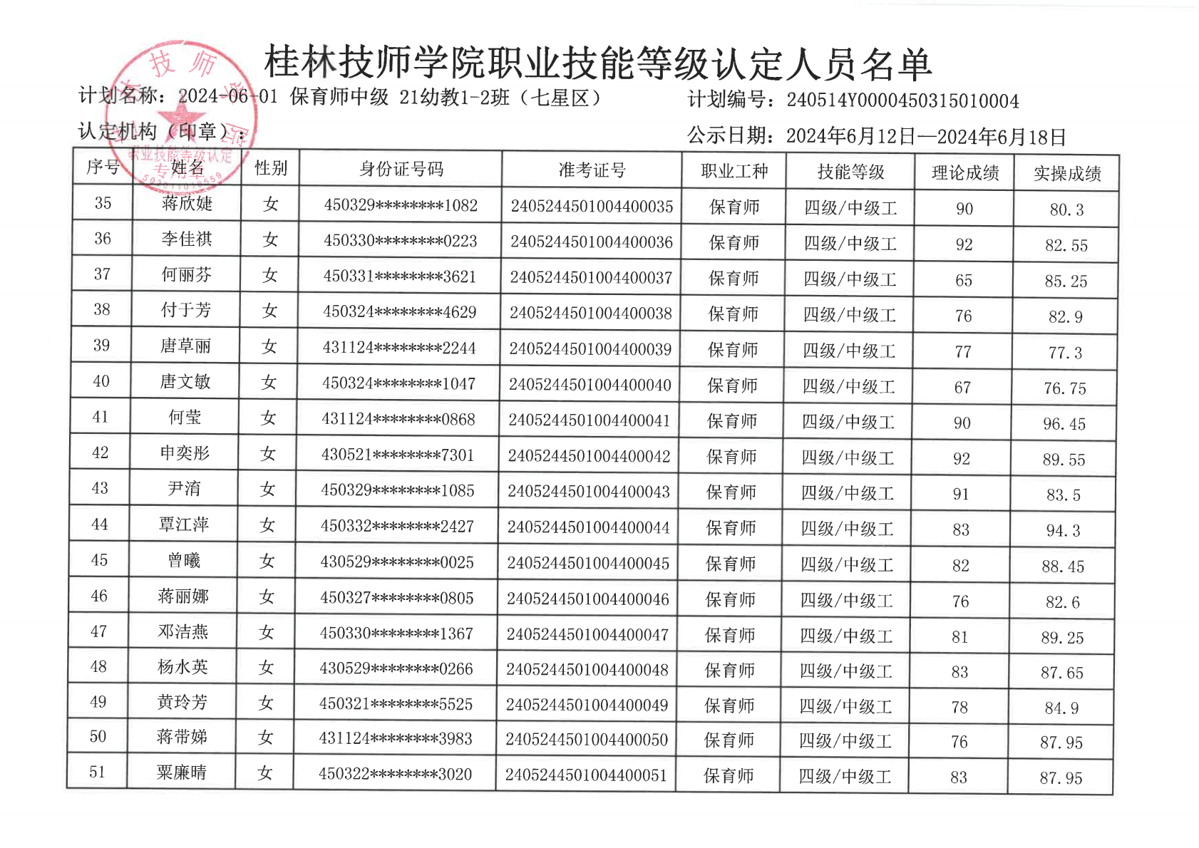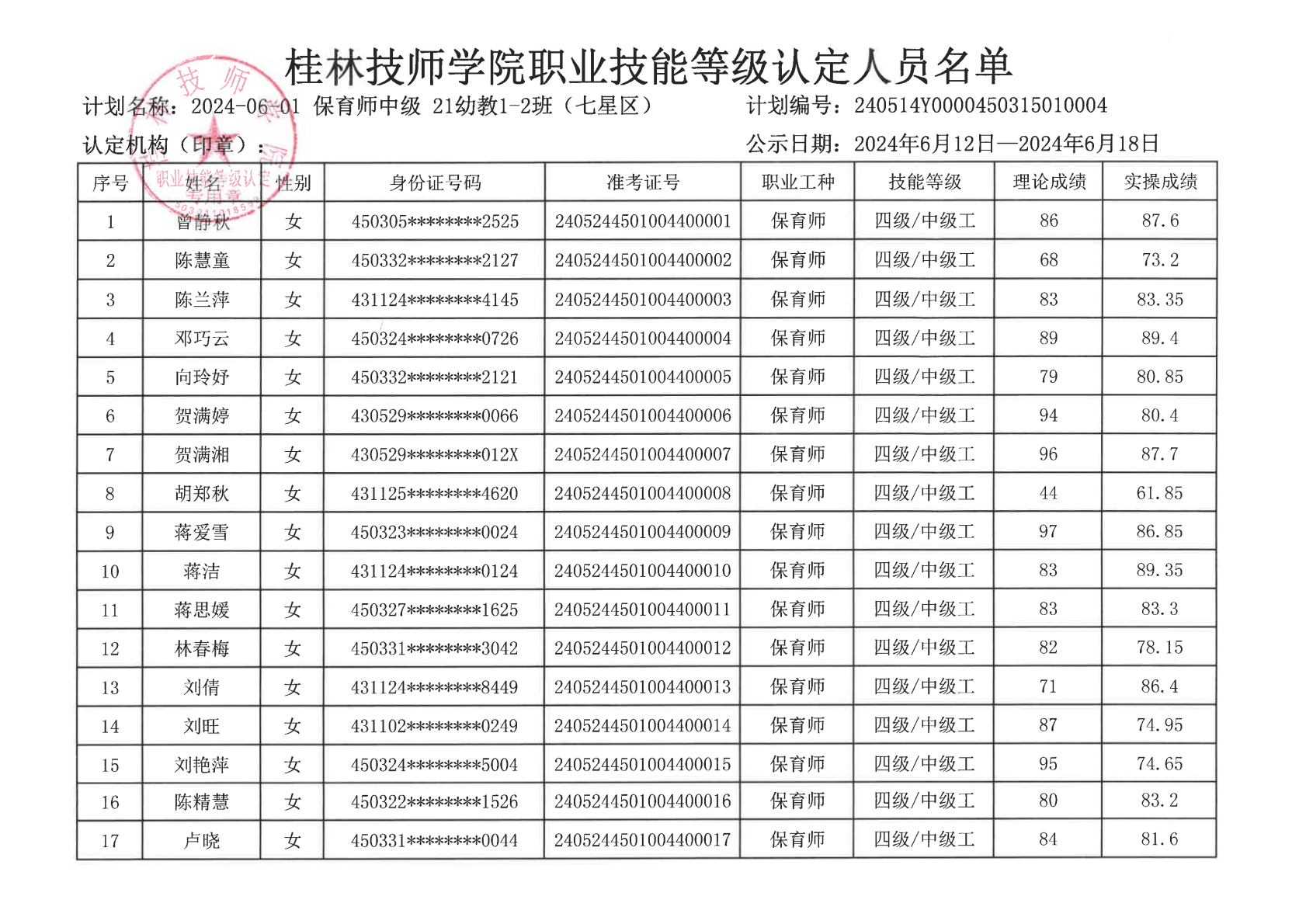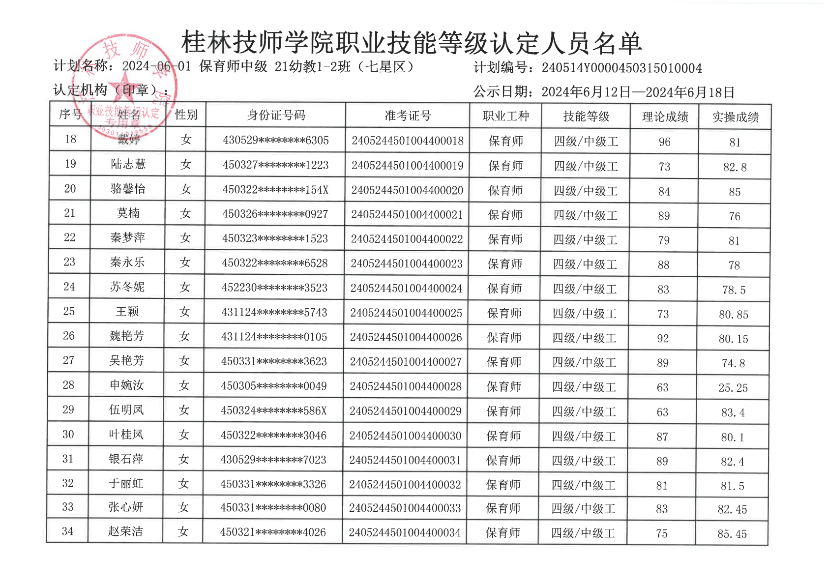 桂林技师学院职业技能等级认定240514Y0000450315010004批次成绩公示