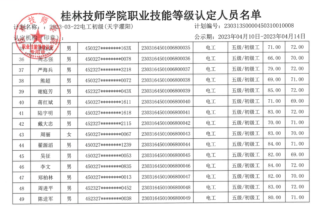 桂林技师学院职业技能等级认定230302S0000450310010003批次成绩公示