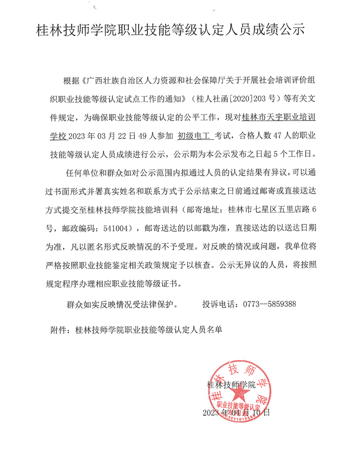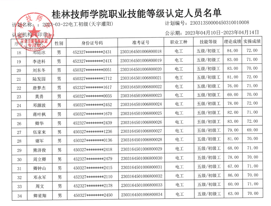 桂林技师学院职业技能等级认定230306S0000450310010004批次成绩公示
