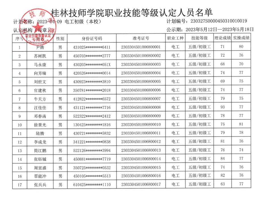 桂林技师学院职业技能等级认定230325S0000450310010017批次成绩公示