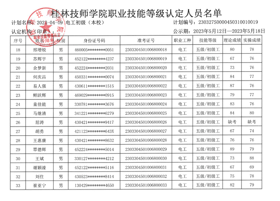 桂林技师学院职业技能等级认定230331S0000450310010020批次成绩公示