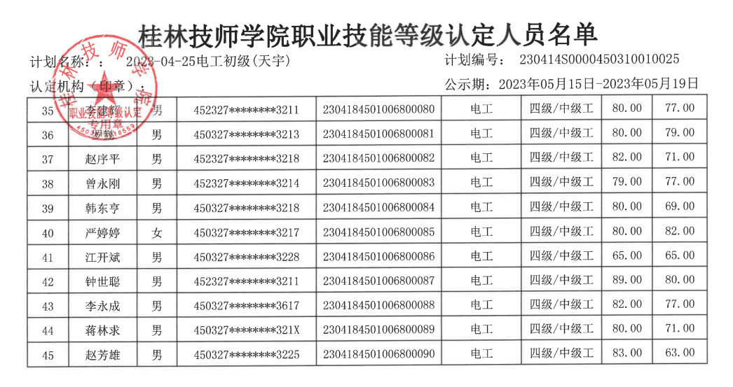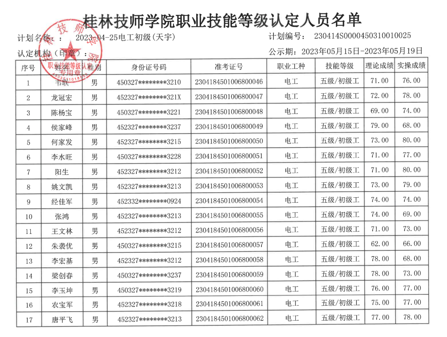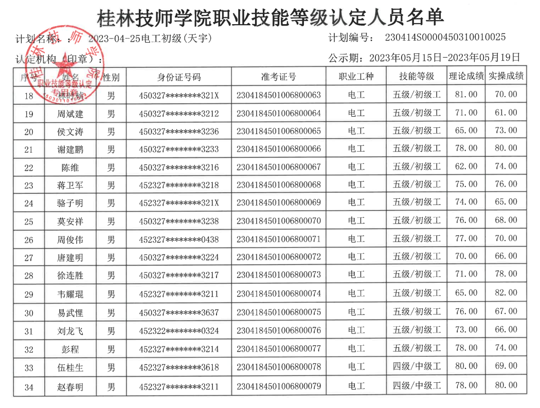 桂林技师学院职业技能等级认定230414S0000450310010025批次成绩公示