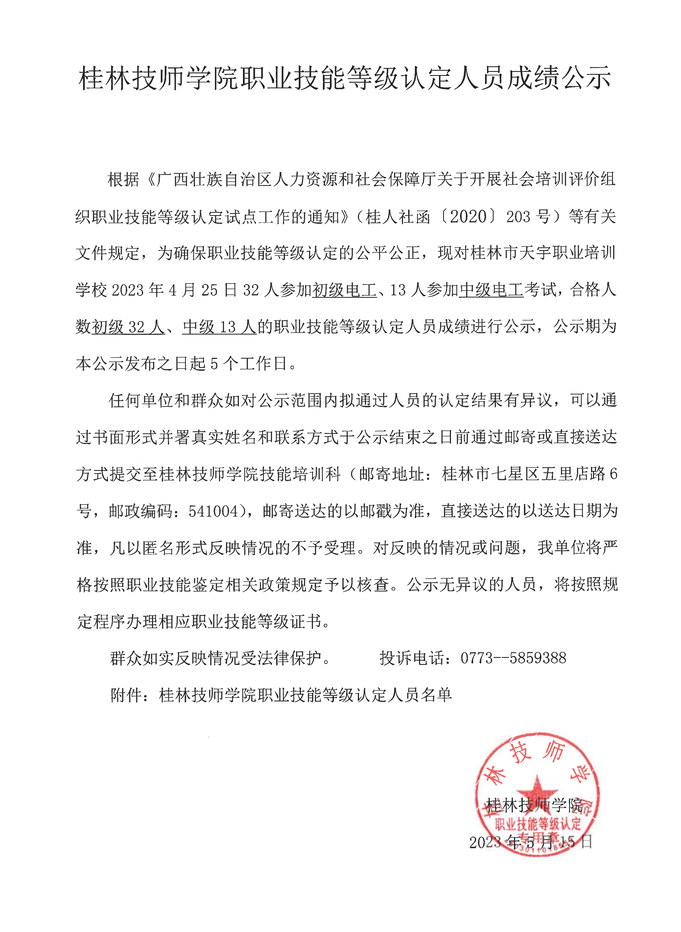 桂林技师学院职业技能等级认定230331S0000450310010020批次成绩公示