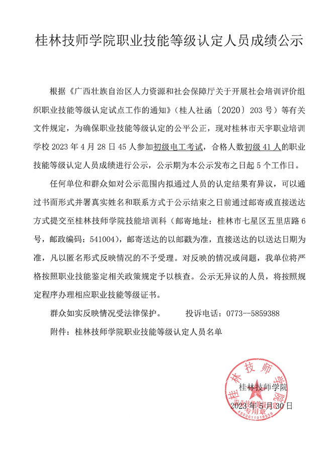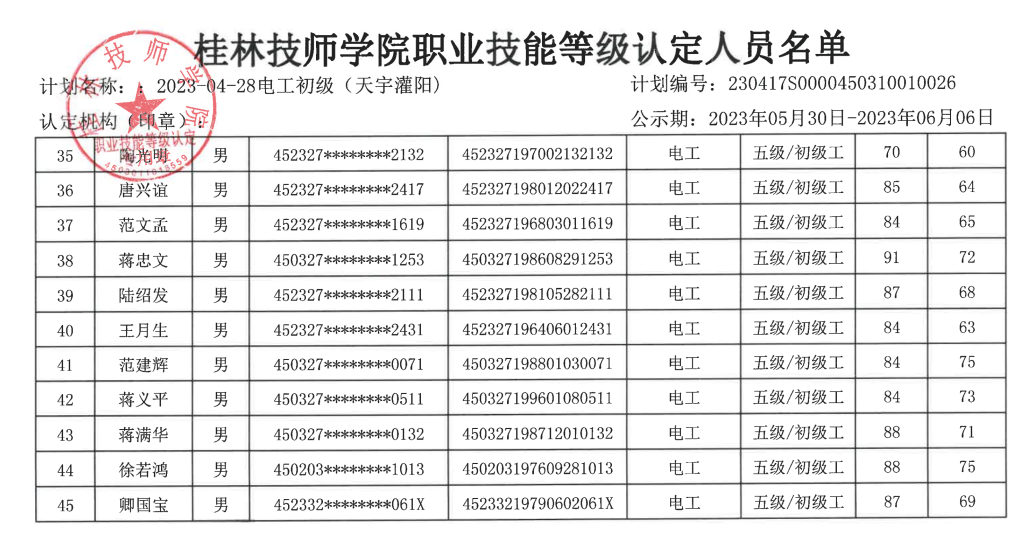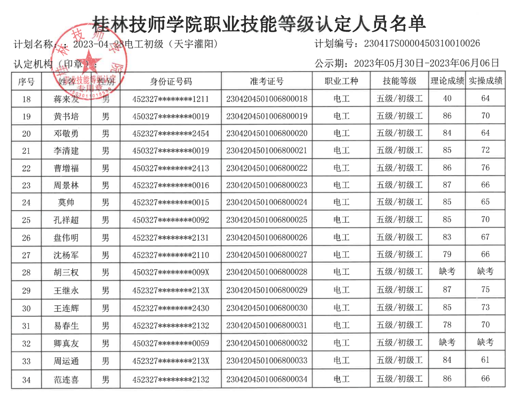 桂林技师学院职业技能等级认定230418S0000450310010027批次成绩公示