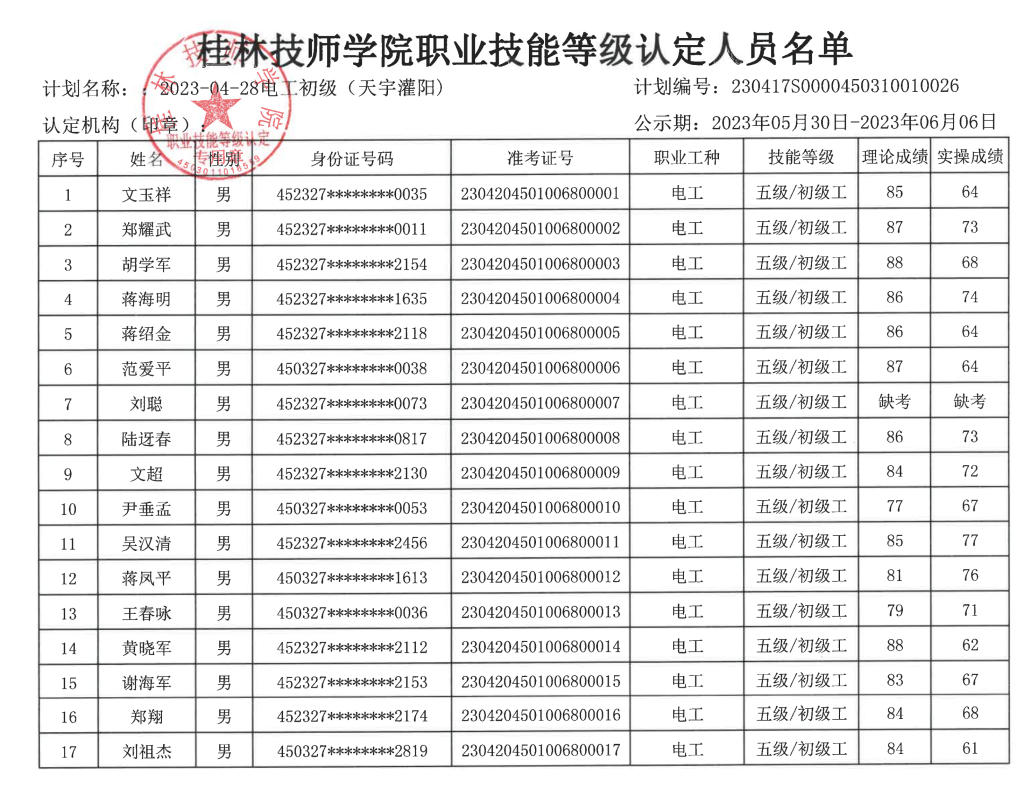 桂林技师学院职业技能等级认定230420S0000450310010028批次成绩公示