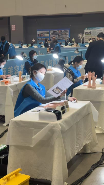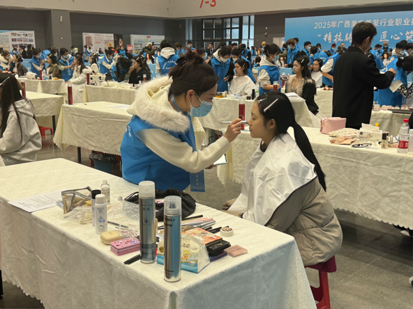 竞赛现场,旅游商务系美容保健专业师生团队凭借扎实的专业功底、规范的操作流程与创新的设计理念,在激烈的技能角逐中展现出良好的职业素养与精湛技艺。赛场之外,旅游商务系精心设计的“技艺传承·融合创新”主题成果展示区成为现场焦点。