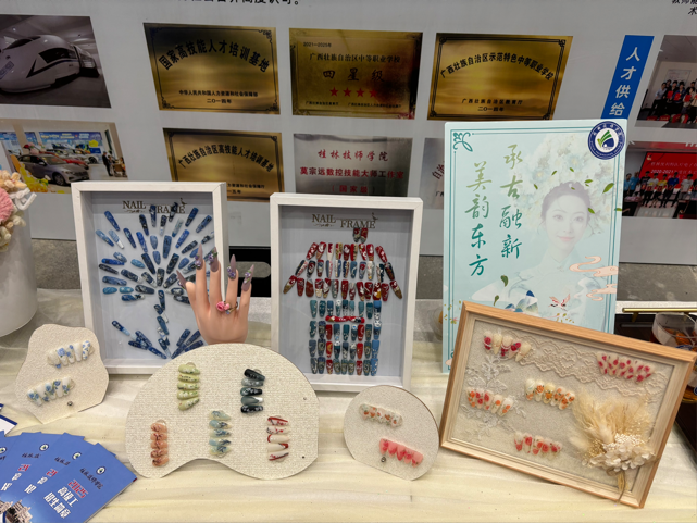 指尖艺术之韵:由师生携手打造的艺术美甲作品格外吸睛,作品将时尚潮流与个性创意巧妙融合,鲜活展现出“精益求精”的工匠精神,成为教学相长的生动缩影。