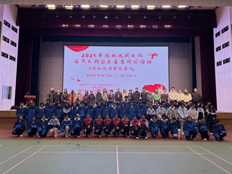 12月24日上午,由八路军桂林办事处纪念馆、桂林技师学院联合主办,广西师范大学出版社、桂林银行叠彩支行承办,共青团桂林技师学院委员会、自治区地方特色劳务品牌漓江导游林罗成专家工作室协办的“红星闪耀照南国”2025年桂林抗战文化历史文物图片展进校园专场活动,在学院大礼堂拉开帷幕。本次活动以重温抗战历史、传承红色基因为核心,通过沉浸式展览、专业宣讲等形式,让红色精神在新时代青年群体中落地生根、薪火相传。