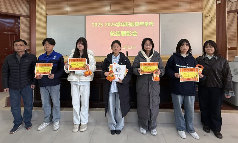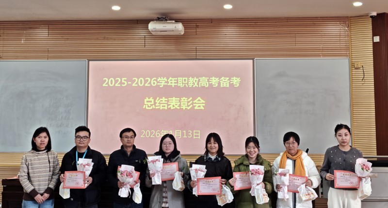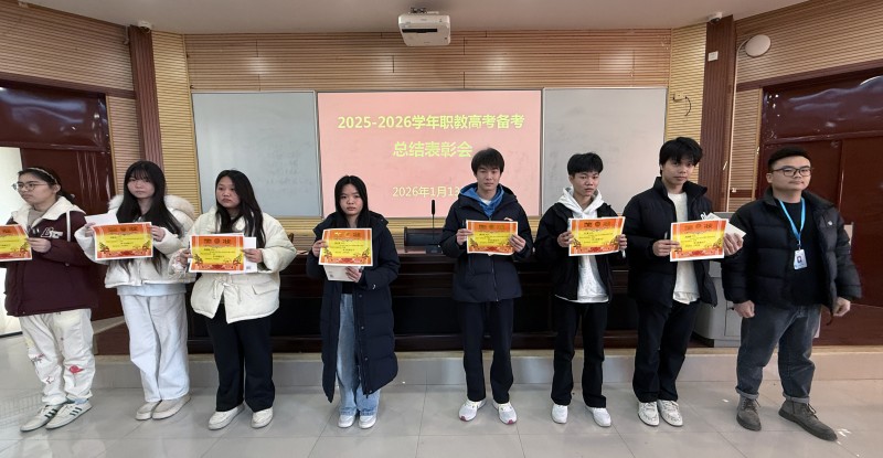 1月13日下午,学院职教高考备考总结表彰会在录播室举行。公共基础部主任何叶、授课教师、班主任及学生齐聚一堂,系统复盘备考成效,凝聚奋进力量,为2026年职教高考冲刺吹响集结号。