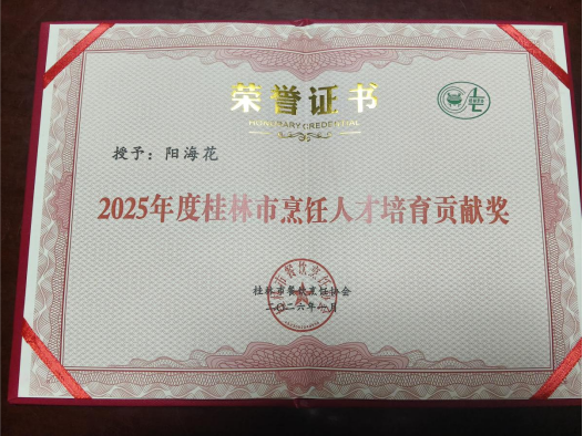 “2025年度桂林市烹饪人才培育贡献奖”证书